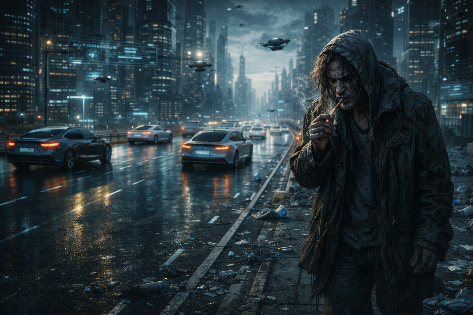 물론 대개는 자살 전 도로를 한참 배회하기 때문에 로봇 패트롤에게 발견되어 구조되긴 하지만, 자살을 결심하고 바로 도로에 뛰어드는 사람들은 기차처럼 멈추지 않고 질주하는 자동운행차량에 치여 대부분 즉사를 한다. 아무리 충돌방지시스템을 탑재한 자율주행 차량들도 높은 교량위에서 차량 위로 떨어지거나 차량 바로 앞에서 뛰어드는 인간들은 회피하지 못했다.